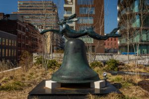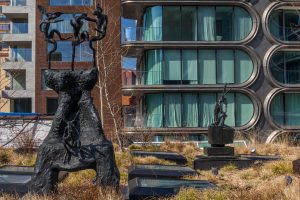 They are viewable from The High Line (once re-opened) three monumental bronze sculptures by Flanagan are available to see this spring and summer. Since October 2018 the Kasmin Sculpture Garden has exhibited large scale works by Robert Indiana, Max Ernst and Joel Shapiro.
